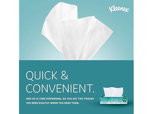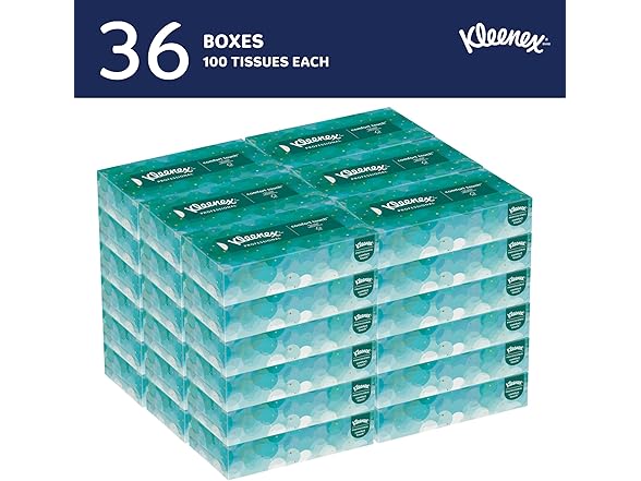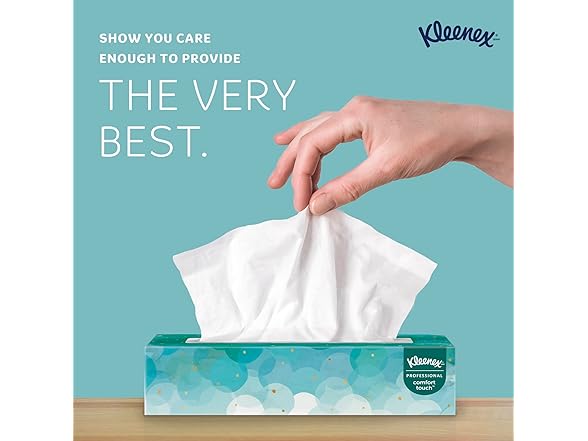 All facial tissues are not created equal. In fact, more people choose Kleenex Facial Tissue than any other brand. Kleenex tissue offers superior performance, a premium feel and essential softness. When your employees, patients and guests see the respected Kleenex brand in your business and restrooms, they'll know that you select quality products, putting forth the best image for your business. It's a popular choice in healthcare and medical offices, hotels and lodging and businesses in general. For more than 80 years, Kleenex has delivered the highest quality among facial tissues, providing consumers with smart innovations like an ultra-soft feel and Signal Sheets (the last 10 tissues are cream colored instead of white, so you know it's almost time for a new box). You'll want to buy them in bulk. Choosing Kleenex lets everyone know that you care enough to provide the very best. Kleenex is the world's number one facial tissue brand, trusted by more consumers than any other Kleenex brand facial tissues have an 80 year history of excellence and high performance The Signal Sheet keeps you ahead of run-outs (final 10 tissues are cream instead of white, so you'll know it's time to replace the box) These bulk tissues are Forest Stewardship Council (FSC) certified. 100 Tissues/Box, 36 Kleenex Professional Facial Tissue Boxes/Case; 3,600 Tissues/Case; 2-Ply; White; Flat Facial Tissue Boxes for Business Kleenex is the world's number one facial tissue brand, trusted by more consumers than any other. Each Kleenex tissue is 2-ply, absorbent, soft and strong Each tissue features smart innovations like an ultra-soft feel Forest Stewardship Council (FSC) certified - made from wood/paper that comes from forests managed to rigorous environmental and social standards, supported by the world's leading conservation organizations. Leadership forestry - from forests or sourcing programs that meet specific environmental standards, helping you support practices that better