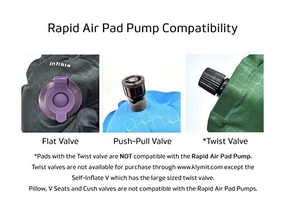 - Connectors for Klymit Static V Models: Whether your air mattress uses a Push-Pull or Flat valve, this portable inflator pump has you covered with included connectors (Does NOT work for Static V Junior, Double V, Hammock V or Insulated Hammock V pads)