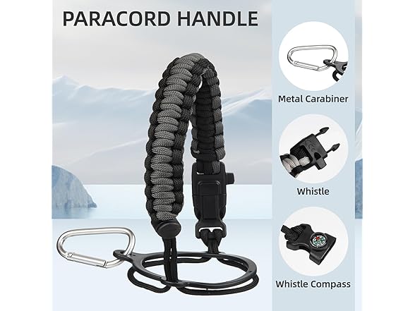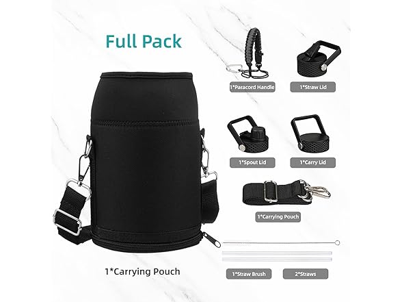 - The large capacity gallon water jug comes in various sizes, including 50 oz, 64 oz, 87 oz, and 128 oz, with a range of colors to choose from according to your need. All sizes of bottles equip with a paracord handle and a pouch for easy carrying