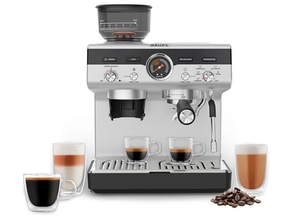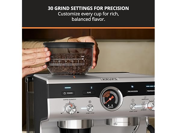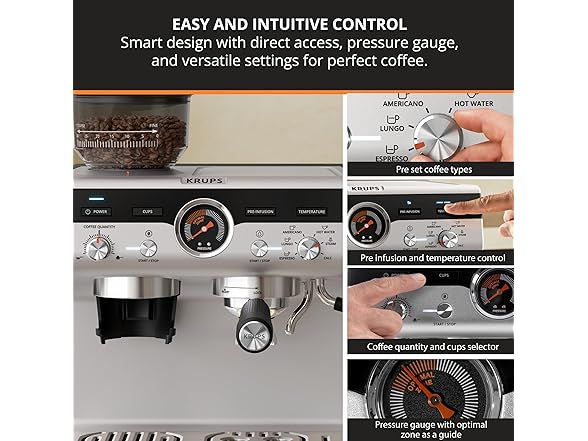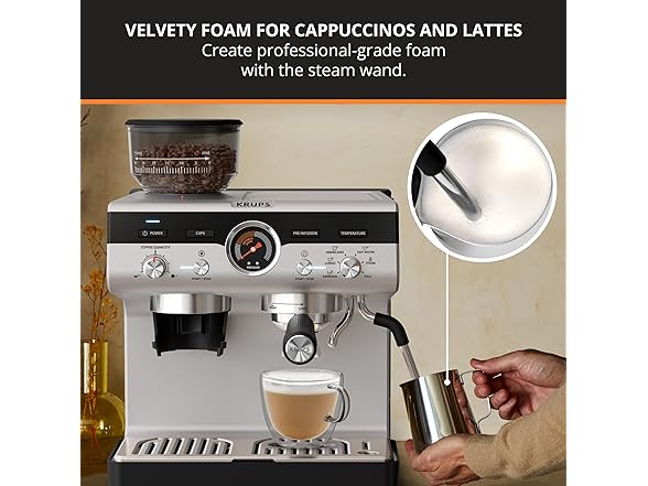 Enjoy an espresso experience like no other with Krups Precision. The built-in grinder comes together with an intuitive interface to offer full control and espresso that's bursting with exquisite flavor and aroma. Designed for latte enthusiasts, the professional steam wand lets you explore the world of latte art while the tamping station with knock box offers the ultimate Barista experienceβwith everything you need to create your signature cup.