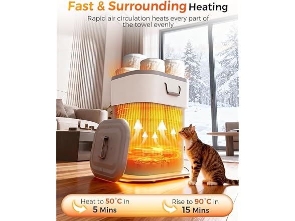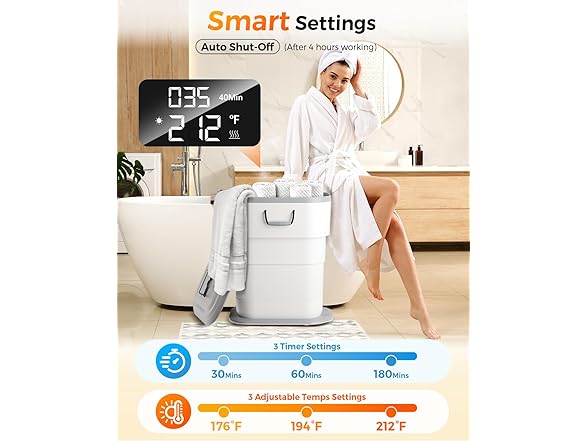 - No Cold Spots, Just Perfect Warmth-Experience perfectly even warmth with our 600W towel warmer. Utilizing advanced airflow technology, it circulates warm air throughout the chamber to eliminate cold spots and ensure consistent heating. Reach a cozy 140°F (60°C) in just 5 minutes, with the ability to heat up to 194°F (90°C) for complete warmth control. The intelligent system maintains uniform temperature across every towel, robe, or blanket, delivering reliable spa-like comfort with simple one-button operation.