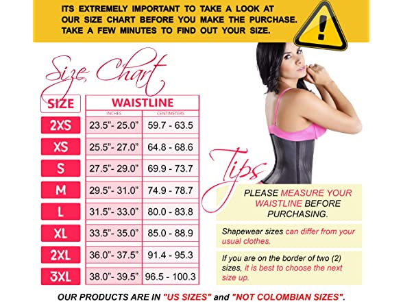 - HOW TO CHOOSE YOUR SIZE: THE BEST WAY TO CHOOSE THE APPROPRIATE SIZE IS BY MEASURING YOUR WAISTLINE AND COMPARE THE MEASUREMENT AGAINST THE SIZE CHART. Please do not choose based on other buyers experience, your body is unique. To properly choose your size, measure your waistline and choose based on the measurement indicated on the size chart. This faja girdle is not recommended to women taller than 5’7”. This waist trainer is not recommended for people sensitive to latex.
