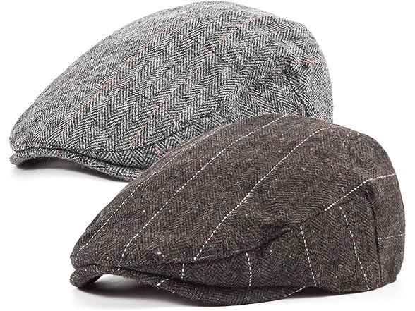2Pack Tweed Newsboy Hats for Men Cap Boy (Plaid Grey+Dark Brown, S/M, 7 5/8)