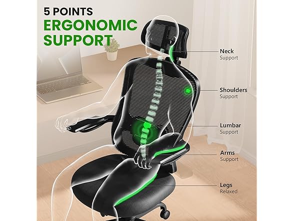 - 5 POINT ERGONOMIC SUPPORT: Our ergonomic office chair provides targeted support at five key areas: neck support, shoulder alignment ,lumbar support, , arm rest, thigh relief. This ergonomic design can be adjusted according to your needs, allowing you to fit from head to toe, get comfortable, eliminate fatigue, and enjoy an excellent sitting experience easily.
