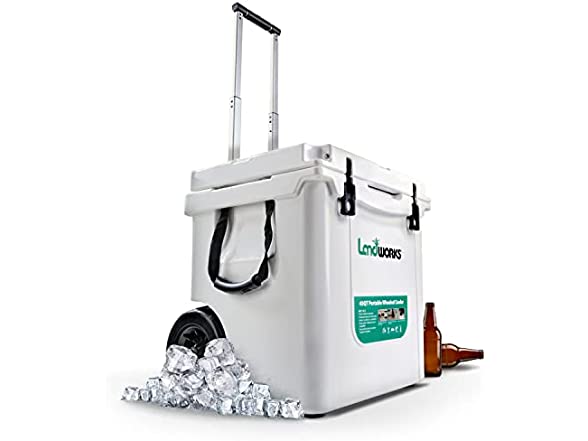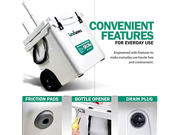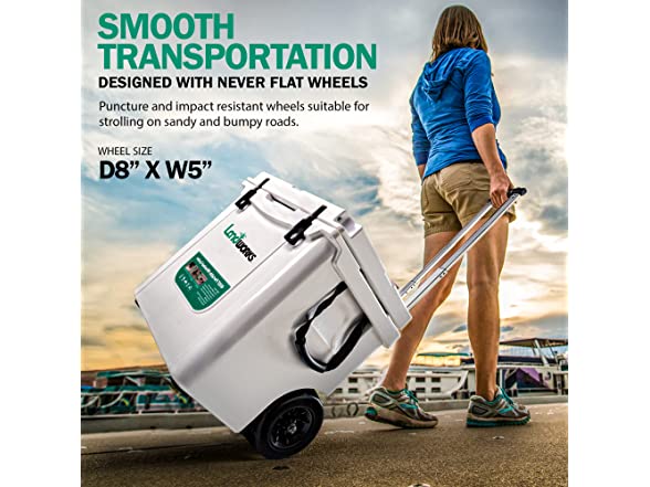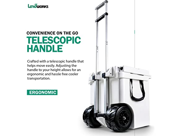- ADVENTURE ANYWHERE - Strutt with style like your 'Cooler Game' has no limit; Our Rotomolded Wheeled 42QT Ice Chest Cooler, Designed with a Handy Aluminum Telescopic Handle and All Terrain Rugged Wheels to make transport easy and fun