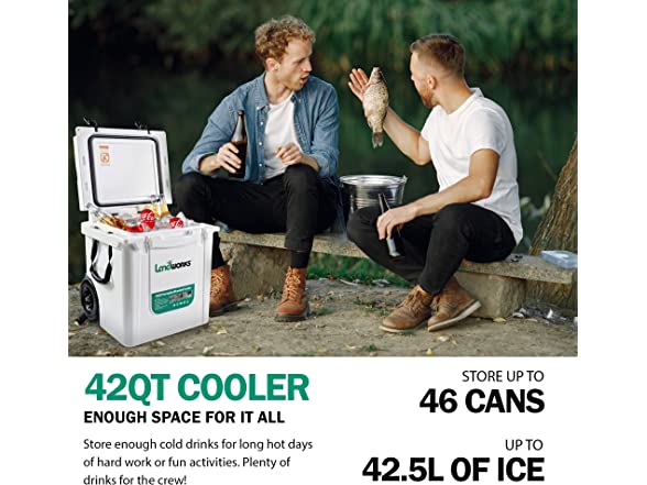 - GREAT STRIDES - Our 42QT Ice Cooler has an approximate of (48) 12oz Cans Capacity (no ice added) (External Dimensions: 22.2L x 17.1W x 18H / Empty Weight: 26.5lbs); Recessed Zero-Leak Drain Plug for fast drainage