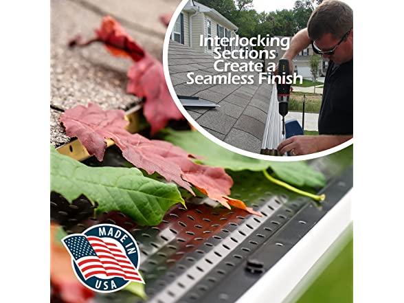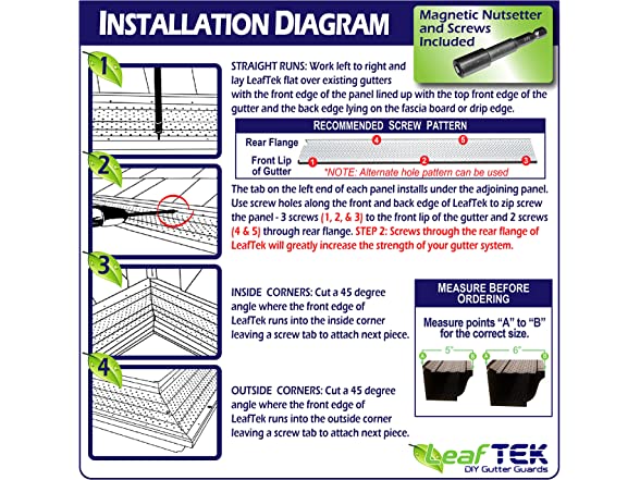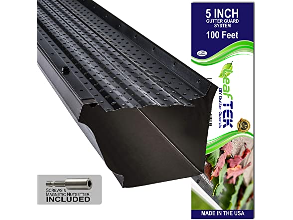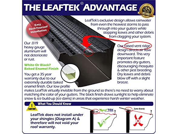 - WHY LEAFTEK? - 100% Made In The USA | Easy to install 4' sections | Strengthens your gutters (see photo #6) | Thick .019 gauge USA aluminum | Stainless steel, self-tap color matched screws included | Hard as nails enamel finish | Proprietary vented raised ridge air flow design | Corners install easily | Does NOT install under your shingles, therefore will not void your roofs warranty | Free shipping