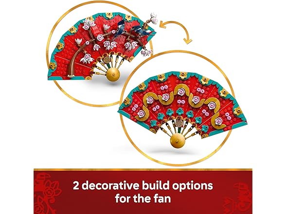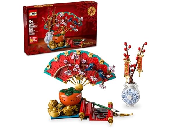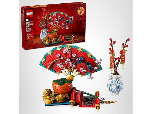 Kids can use their creativity to make beautiful home décor and honor traditions with the LEGO Spring Festival Good Fortune (80117) building toy for 9-year-old girls and boys. This educational toy offers families a fun activity they can share together, and it is a great way for parents to share cultural traditions with their kids. Proudly display this model, with objects that symbolize a future filled with love, good health, prosperity and joy. The LEGO Festival Spring set features a beautiful fan decorated with 2 magpies flying above a branch of spring blossoms, a vase of fortune red fruit, persimmon fruit, golden ingots and a calligraphy pen with a scroll showing ‘spring’ in Chinese text. Customize the set with 2 design options for the fan (instructions included), and other items which can be removed from the base so builders can create their own unique, festive home decor. Check out other building sets (sold separately) in the LEGO Spring Festival range. Contains 1,021 pieces.