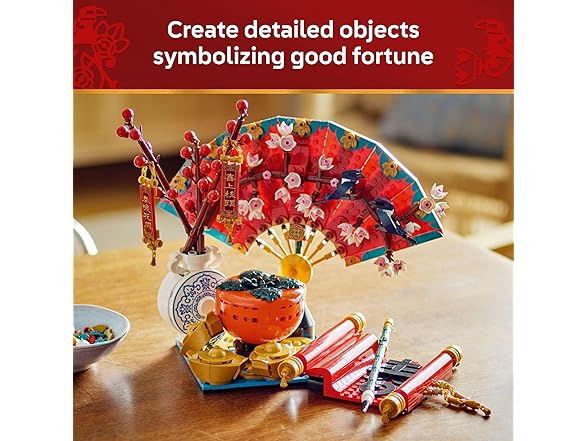 - SYMBOLIC FEATURES – This set features symbols of good fortune, including a fan decorated with 2 magpies (a reminder that good things come in pairs), a vase of fortune red fruit, a persimmon fruit, 3 golden ingots and a calligraphy pen with a scroll