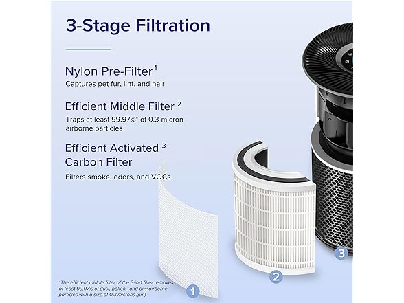 - 3-STAGE FILTRATION: Filtration includes an Efficient MiddleFilter, which traps pollen, dust, and pet dander, and an Efficient Activated Carbon Filter that helps neutralize odors, cooking and wildfire smoke, and VOCs