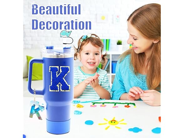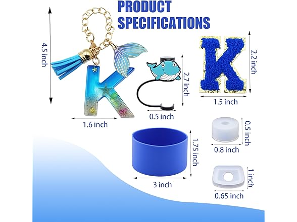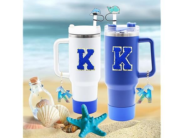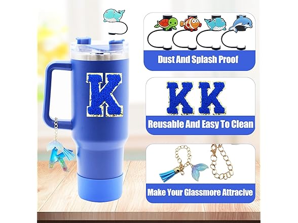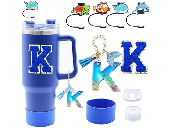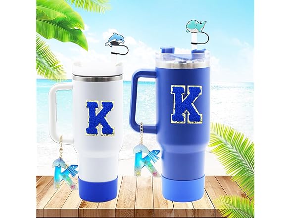 Liangang 9Pcs Ocean Blue Stanley Cup Accessories Set,Including Boot,Spill Proof Stopper,4Pcs Animals Straw Cover,Initials Handle Charm and Sticker Letter for Stanley Cup 30oz 40oz (Blue K)