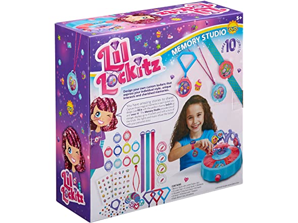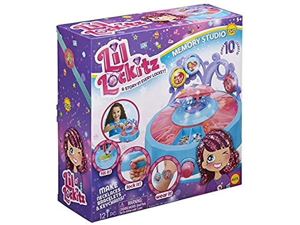 Lil' Lockitz Memory Studio by ALEX Toys lets you express yourself as never before to create something truly personal, for yourself or a loved one. Lil’ Lockitz supplies you with gems,backgrounds and charms of your favorite things to float in a wearable collage that tells a story. Memory Studio is your super deluxe design kit for creating Lockitz. With 11 covered compartments there’s room to organize and store all of your charms and locket pieces. Choose the locket you want to make, fill it with the perfect colors and pieces, lock it and with a turn of the knob, the lights and music infuse the locket with your personal story. Then you can wear it as a necklace, bracelet or even use the Keychain Clasp to make a clip-on! Memory Studio even has a place to store up to 4 lockets when you’re not wearing them. The set comes with everything you need to make 10 Lockitz! Includes Memory Studio with Locket Display (3 pc), 10 Locket Tops, 10 Locket Backs, 4 Necklaces, 3Bracelets, 3 Keychain Clasps, 40 Charms, 30 Gems, 16 Backgrounds, Tweezers,Photo Stencil, Easy Instructions. 3 AA Batteries required, batteries not included. Recommended for children 5 years of age and older.