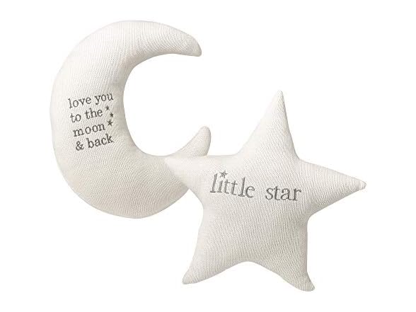 - The moon pillow has the verse "love you to the moon and back" with the star pillow featuring the words "little star" embroidered on the front. The backs of both of the pillows remain plain.