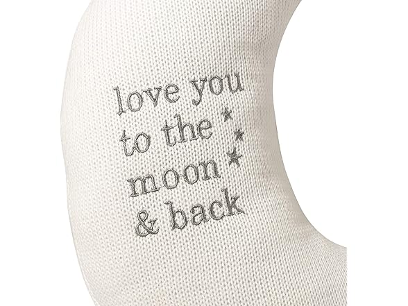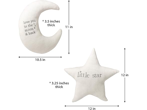 Lillian Rose White Star and Gray Moon Nursery Pillow Set. Display your love for your new "little star" "to the moon and back" with the Moon and Star baby nursery pillow set. The pillows material is an off white knit fabric with soft gray embroidered writing. The moon and star pillows are the perfect gender-neutral nursery decoration. Made with cotton and polyester fill. The star measures approximately 11.25 inches in height by 12 inches in width. The moon measures approximately 11.25 inches in height by 10.5 inches in width. These pillows are sure to complete the room!