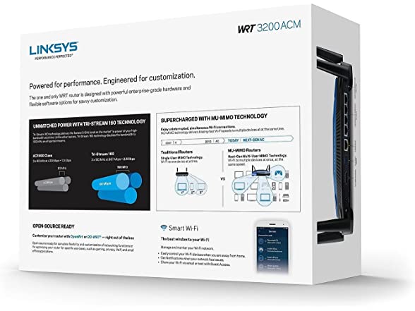 The one and only WRT router is designed with powerful enterprise-grade hardware and flexible software options for savvy customization. Tri-Stream 160 technology delivers the fastest 5 GHz band on the market* to power all your high-bandwidth activities. Unlike other routers, Tri-Stream 160 technology doubles the bandwidth to 160 MHz on all spatial streams. MU-MIMO technology delivers blazing-fast Wi-Fi speeds to multiple devices all at the same time. Open-source ready for complete flexibility and customization of networking functions or for optimizing your router for specific use cases, such as gaming, privacy, VoIP, and small office applications.