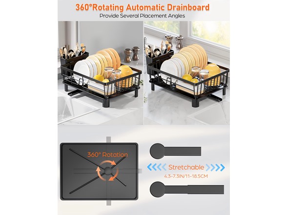 【Upgraded Automatic Drainage System】Our dish drying rack is designed with a removable drain board with a concave middle design that allows water to flow quickly to a 360° rotating and retractable rotating spout, and an improved knife and fork box with a leaky bottom to direct water to the drain board for easy and convenient use. Maintain a dry and tidy countertop.