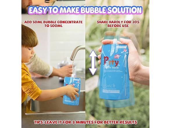- 【Exquisite Details】To make the bubble machine more reliable and less troublesome, we upgraded the motor and freestanding tank which reduced breakdowns and leakage. Included 50ml*1 bubble concentrate, you can add to 500ml to create bubble solution, note that shake hardly for 20s before use.