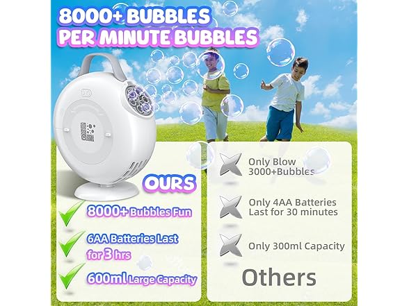 - 【600ml Capacity for 3 Hrs Long-lasting Bubble Fun】Embark on a magical journey with our bubble maker machine! Featuring a generous 600ml capacity, it ensures 3 hrs of uninterrupted bubble bliss. Say goodbye to refills and hello to non-stop enchantment for your events. Elevate your celebration with this compact reservoir of joy – grab your bubble blower machine now!