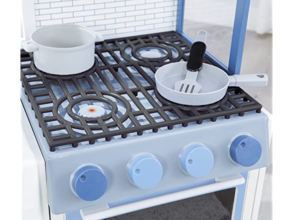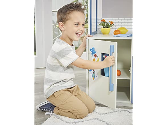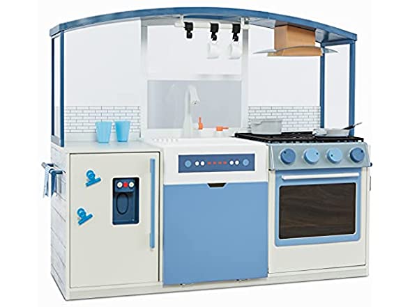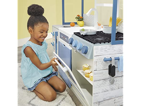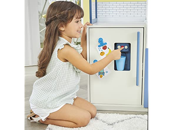 - SPECIAL FEATURES: The canopy comes with built-in lights, hanging rack and vent hood. And the fridge features an ice dispenser that makes sounds and a front door that can be customized with notes and photos using the included clips. Plus, the oven lights up and has burners that make sounds for enhanced fun.