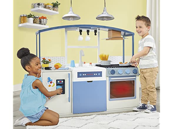 - REALISTIC: This designer inspired kitchen is equipped with everything kids will need to let their inner chef and social entertainer out. And realistic buttons, knobs, dials, lights and sounds enhance play.