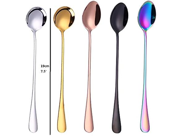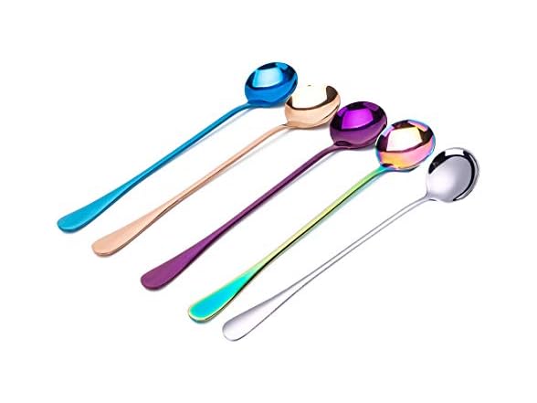 Long Handle Magic Tea Stainless Steel Multicolored Rainbow Spoon Set - 5 Pieces for Iced Tea, Ice Cream, Coffee, Milkshake, Dessert, and Cocktail Stirring