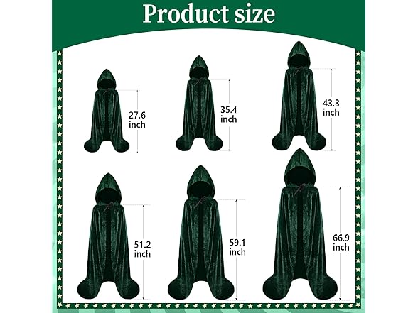 - Long Hooded Cloak 6 Sizes Choice: size length shoulder to floor (excluding hat) XS: 27.6 inches/ 70 cm, S: 35.4 inches/ 90 cm, Medium: 43.3 inches/ 110 cm, L: 51.2 inches/ 130 cm, XL: 59.1 inches/ 150 cm, 2XL: 66.9 inches/ 170 cm; and the length of the cape does not include the hood