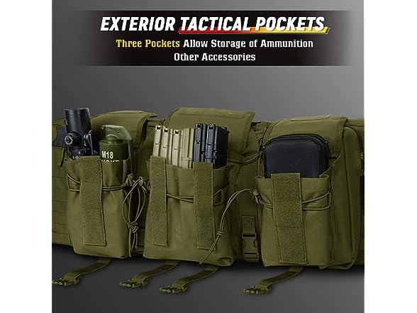 - 【 SMART STORAGE DESIGN 】2 way zippers on the main compartment which goes around 3 sides, you can open the gun bag up and lay it out flat. 4 rows of molle straps on the front of the bag enable users to attach extra small pouches and other items. The three fixed front pouches, all closed by a quick release buckle, velcro and drawstrings.