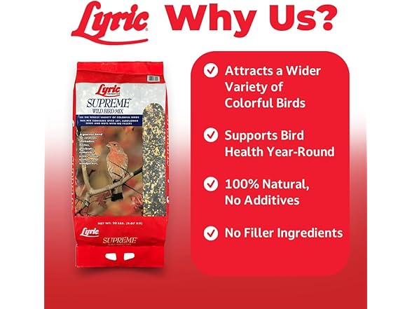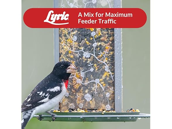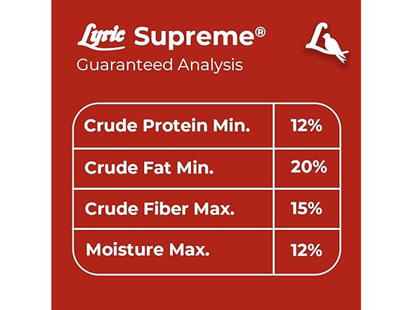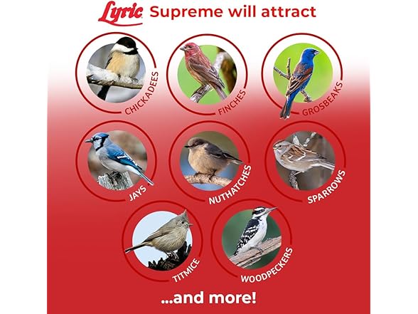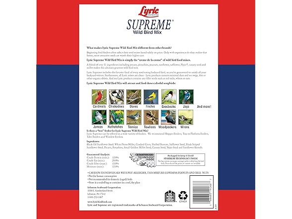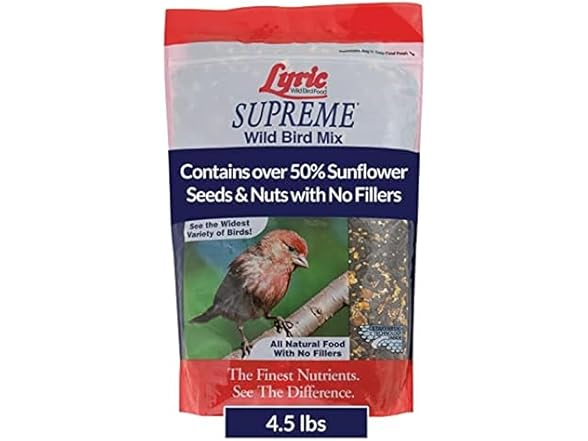 Lyric Supreme Wild Bird Mix is a high-quality outdoor bird food designed to attract a wide variety of wild birds to your backyard. This nutrient-rich blend is made with sunflower seeds for birds, including black oil sunflower seeds, striped sunflower and sunflower kernels —perfect for fueling birds’ energy throughout the seasons. In addition to over 50% from sunflower seeds, the mix also includes safflower bird seeds, white proso millet and small golden millet for birds, shelled peanuts, cracked corn, pecans, pistachios, canary seeds, and Nyjer seeds. Together, these ingredients support bird health and encourage natural foraging behaviors. Ideal for use in all types of feeders—tube, hopper, tray, or window—this outdoor bird seed attracts songbirds such as chickadees, finches, titmice, grosbeaks, woodpeckers, sparrows, jays, and nuthatches. Whether you enjoy casual birdwatching or are an avid wildlife photographer, Lyric Supreme makes every backyard moment more vibrant. Bring nature closer with this premium outdoor bird food that keeps your feathered visitors coming back for more.