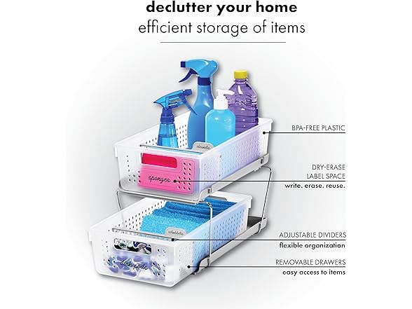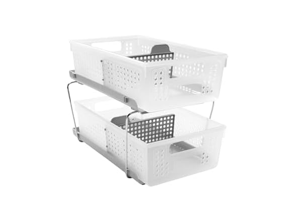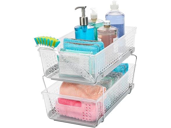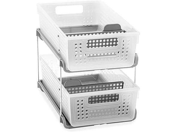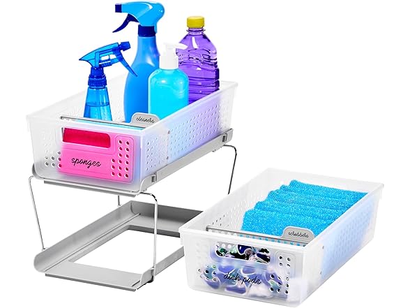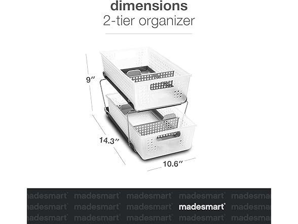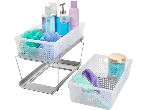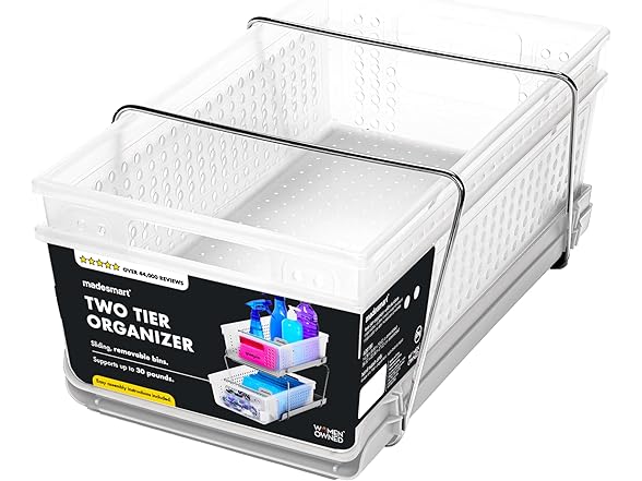 madesmart 2 Tier Bath Organizer, Undersink Storage with Sliding Drawers, for Cleaning Supplies, Pantry, Sponges, Bottles & Kitchen Essentials, Adjustable Dividers & Pull Out Sliding Baskets, Frost