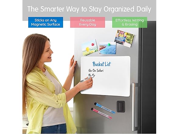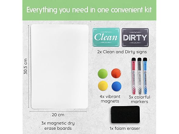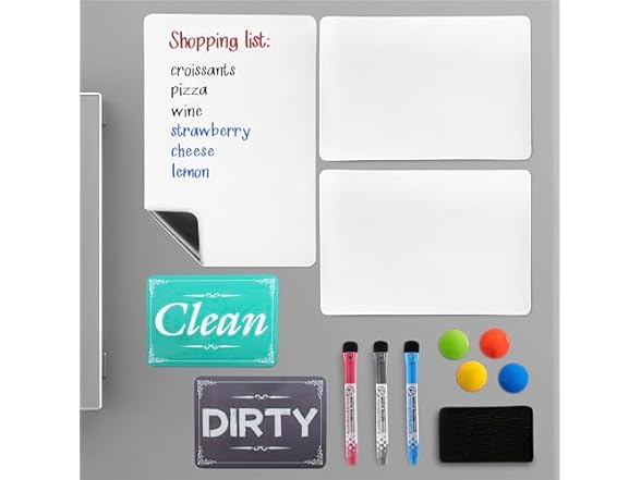Stay organized and inspired with our all-in-one Magnetic Whiteboard Set – perfect for your kitchen, home office, classroom, or dorm. This versatile bundle includes everything you need to plan, write, and keep track of your day-to-day. With 3 magnetic whiteboards (12x8 inches), 3 dry erase markers with built-in erasers, 4 colorful magnetic pins, a magnetic board eraser, and a 2 pack clean/dirty dishwasher magnet, this set is designed to bring order and creativity to any metal surface. Each whiteboard features a strong full-magnet backing to ensure it stays in place—no slipping or sliding. Whether you're jotting down grocery lists, chore charts, meal plans, reminders, or fun drawings, the smooth PET surface allows for effortless writing and easy erasing, even after weeks of use. The compact size makes them ideal for smaller spaces while still providing plenty of room to get organized. Use them as fridge whiteboards, classroom learning tools, message boards, or task trackers. The included magnetic pins help you post notes or photos, while the clean/dirty magnet is a game-changer for dishwasher use. Perfect for busy families, students, or anyone who loves a neat and creative space. ✅ All-in-one organization set ✅ Strong magnetic backing ✅ Easy to write on & wipe clean ✅ Multi-use: home, school, office ✅ Makes a great gift for all ages
