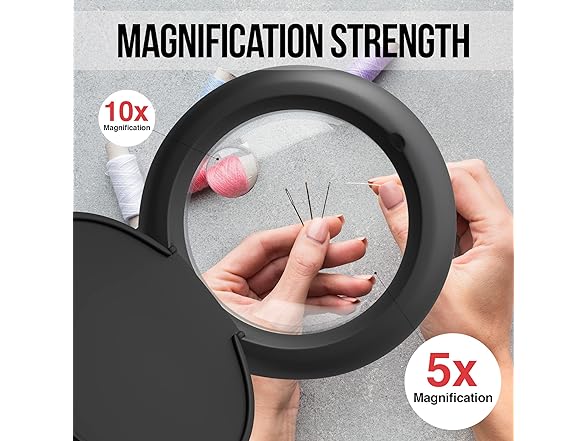 - High Vision with 5X and 10X magnifier: Our magnifying glasses with light for close work, enables you to see objects clearer and larger. without any distortions. The main magnifier is 5X and the 10X magnifier can be used for more specific needs.