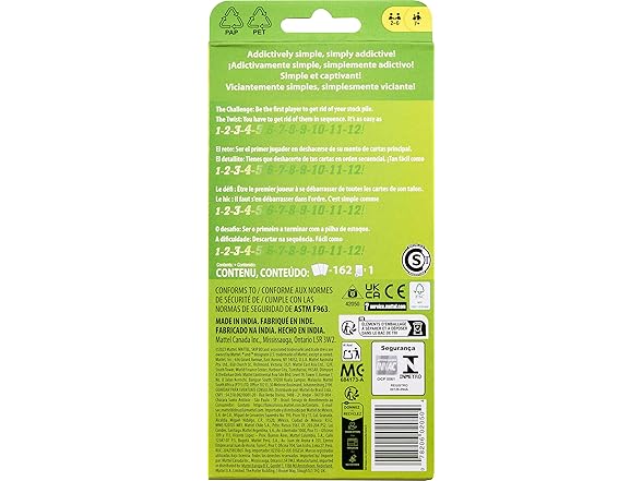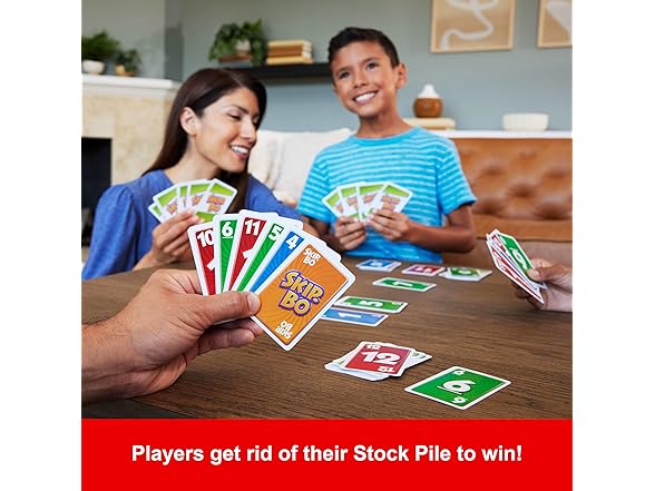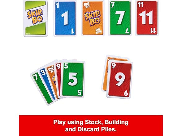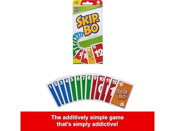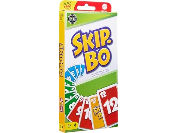 Skip-Bo is the sequencing card game from the makers of UNO game that's easy to learn and all kinds of fun Players use skill and strategy to create stacks of sequentially numbered, ascending cards (2,3,4) until they have no more left to play. The first player to deplete their stockpile wins. Skip-Bo Cards are wild and mix up the action -players should use them wisely. Bring Skip-Bo along on game night and pile on the fun Includes 162 cards and instructions. Designed for 2 to 6 players ages 7 years old and up. Colors and decorations may vary.