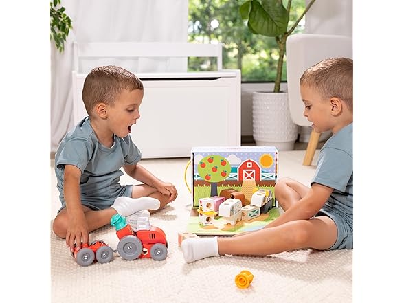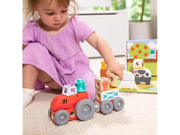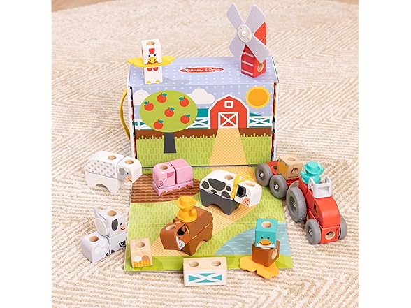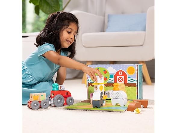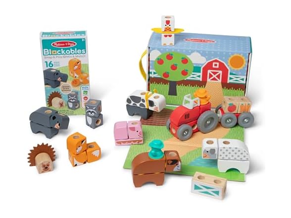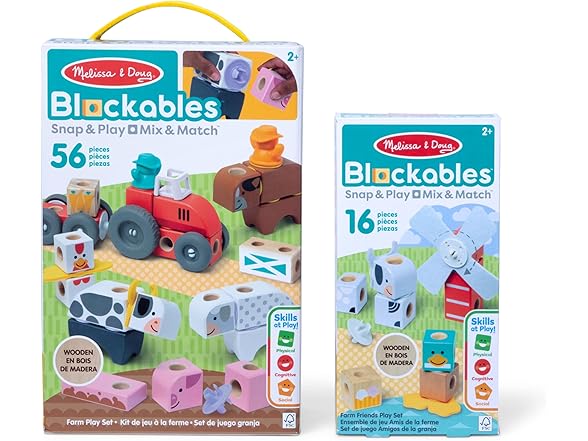 Melissa & Doug Blockables™ are linkable, stackable, and playable! The solid wood connect-and-play building blocks are perfect manipulatives to help preschoolers two and older boost developmental skills (fine motor, problem-solving, matching, storytelling, and self-esteem), while using their imaginations and having fun. Easy-to-grasp smooth, colorful wooden blocks fit together in a snap with large connectors that even little hands can push in and pull out! Each set in this 2-pack bundle includes an illustrated guide showing how to arrange and link the Blockables™ to create multi-textured animals, buildings, vehicles, and more, or kids can use their imaginations to mix, match, and combine pieces to make Kids can easily expand their collection -- the 57-piece Farm and 16-piece Farm Friends play sets are compatible with all other Blockables™ play sets. The packaging in the large set folds out to convert into a fun play space and pieces store in the sturdy corrugated boxes (with a soft handle on the large set) for easy cleanup and portability.