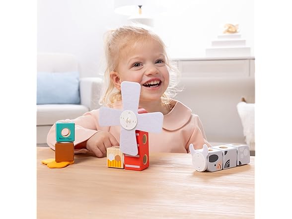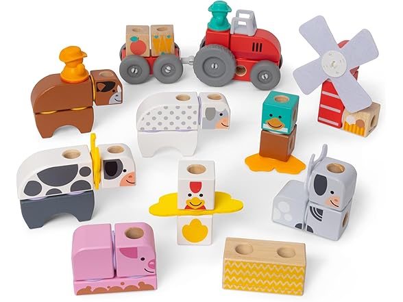 - This 2-pack Blockables bundle includes the 57-piece Farm Play Set and the 16-piece Farm Friends Play Set, each with solid wood blocks, connectors, felt pieces, play figures, and illustrated instructions; build animals, equipment, unique creations
