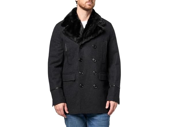 Karl Lagerfeld Paris Men's Outerwear Faux Fur Collared Wool Coat, Charcoal/Black