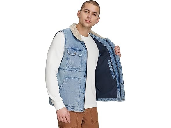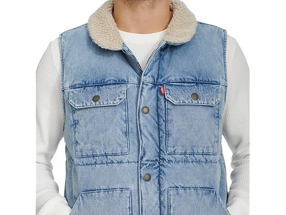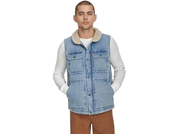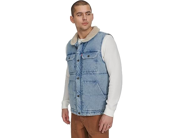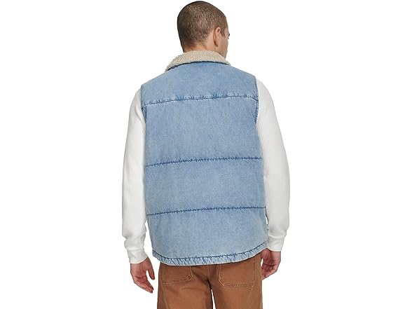 Levi's Men's Mixed Media Quilted Puffer Jacket With Sherpa Lined Collar (Regular and Big & Tall Sizes), Light Wash Denim Vest, Medium