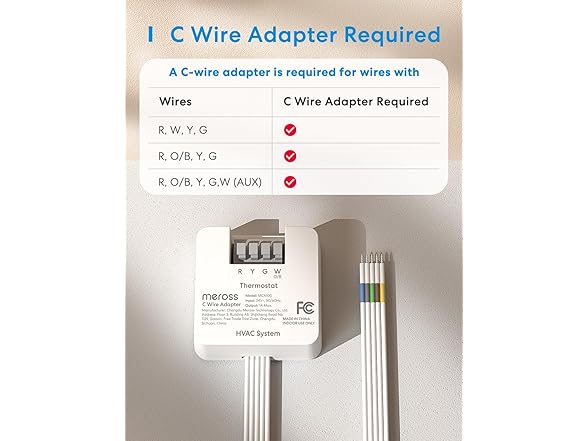 - Note: This wifi thermostat requires a C-wire (common wire) for proper functionality. If your HVAC system does not have one, you can search for "meross C-wire adapter”to purchase a compatible adapter. This thermostat only supports 2.4GHz Wi-Fi networks