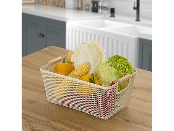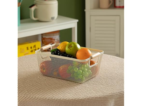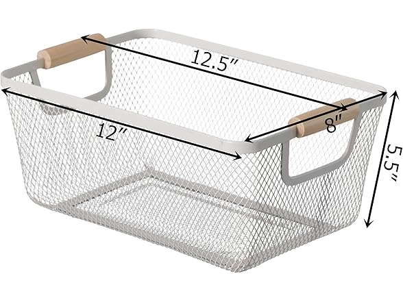 - Basket Dimensions: 12.5" W x 8" L x 5.5" H. Crafted from metal mesh with a smooth, perforated interior that helps prevent bruising of fruits and vegetables. Ideal for rinsing and keeping produce fresh, this basket also brings a decorative touch to your kitchen or dining area with its charming wooden handle and clean, airy design—a perfect blend of function and style.