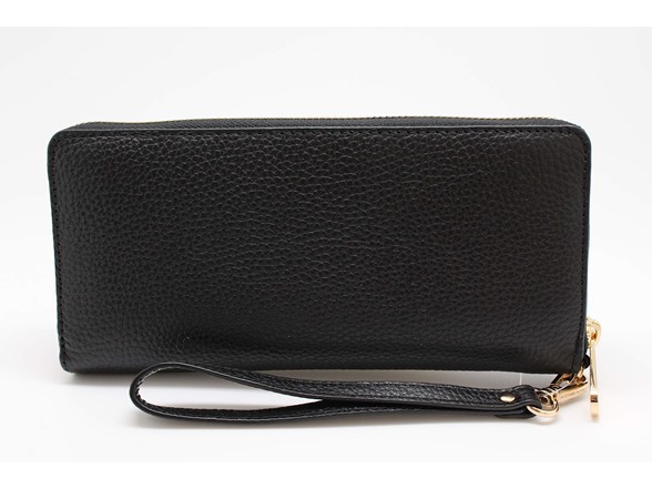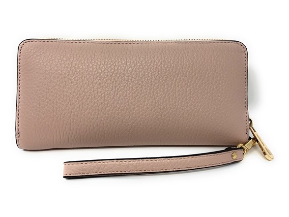 - Large travel wallet wrapped in pebbled leather finished with polished golden tone hardware