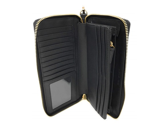 - Interior also offers a zippered coin pocket and (6) full length slip compartments