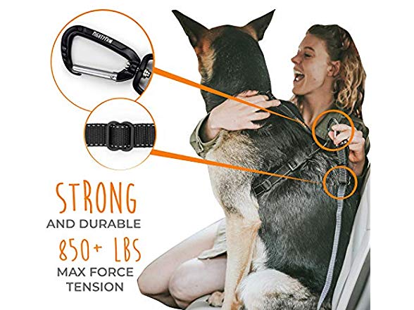 - DEPENDABLE: Other pet seat belt systems can accidentally be released if the dog steps on the buckle button. This cannot happen with the Mighty Paw Safety Belt as we use a secure hook attaching directly to the vehicle's latch bar. To attach to the dog's harness, the Mighty Paw Safety Belt uses an easy to grasp, durable, carabiner that allows for a quick release in case of an emergency. The carabiner is made of extra strong, yet lightweight, AVIATION ALUMINUM with a Max Force Tension of 400 KG!