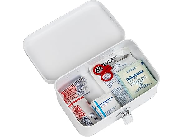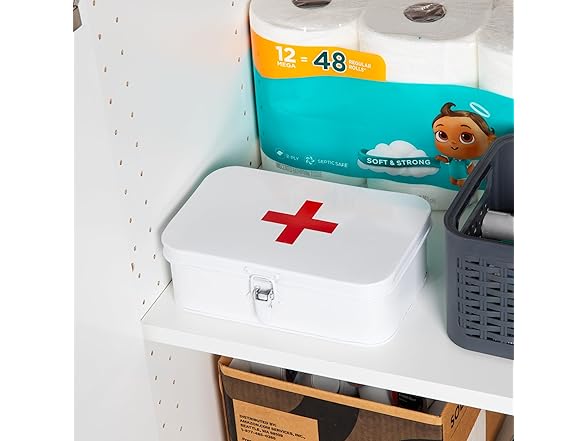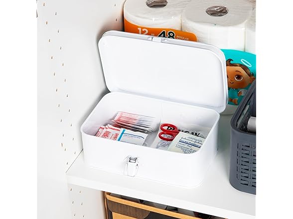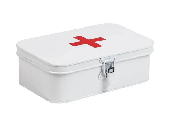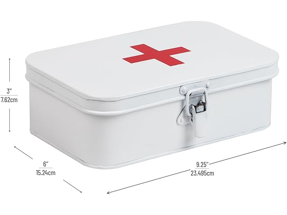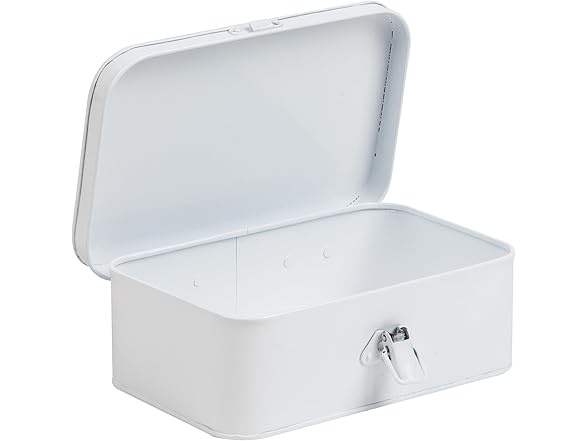 Mind Reader First Aid Box, Emergency Kit, Medical Supply Organizer, Vintage, Buckle Lock, Metal, 9.25"L x 6"W x 3"H, White