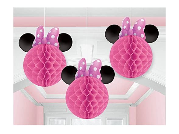 Have a ball with our Minnie Mouse Hanging Decor! Each package comes with 3 - 10" tissue honeycomb balls with card stock cutouts of Minnie's bow and ears. Honeycomb decorations ship flat. Some assembly required. Strings included for hanging.