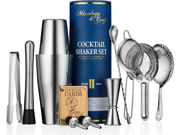 - BARTENDING KIT: The 11-pc bar set includes an 18 and 28 oz tin, a Japanese-style jigger for easy measuring and pouring, muddler, 2 liquid pourers, a bar spoon, ice tongs, and 3 types of strainers to hold the ice back. Every tool you need to concoct alcoholic beverages!