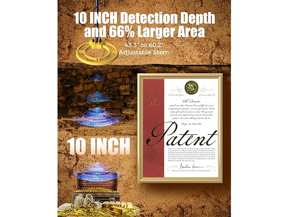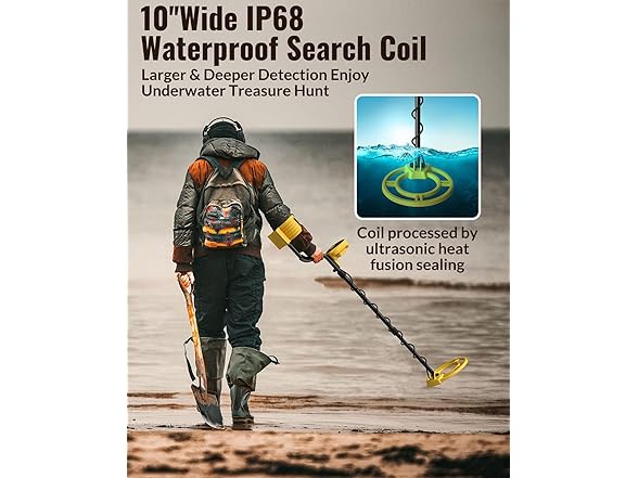 - IP68 Waterproof Search Coil – The 10-inch search coil is IP68 waterproof, allowing you to explore beaches, rivers, and shallow water for hidden treasures up to 10" underground. Equipped with a upgraded DSP chip, our detector offers 66% larger detection area and improved accuracy compared to others. (Note: The control box is not waterproof. For seawater use, lower the sensitivity to minimize interference.)