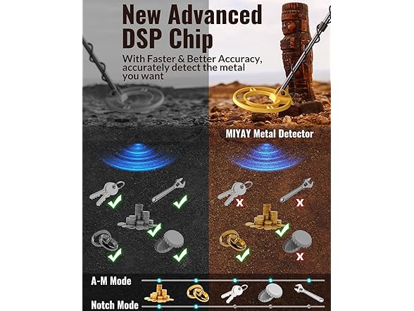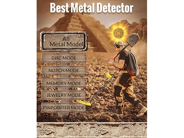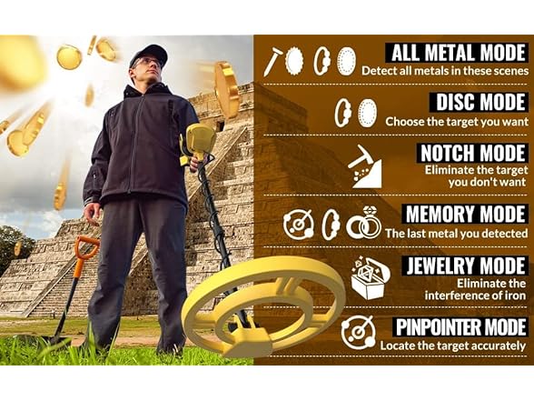 - Easy-to-Use for Beginners with Advanced Features – Our metal detector features 5 specialized modes: ALL METAL, DISC, MEMORY, JEWELRY, and PINPOINTER. Whether you're searching for gold, silver, or relics, these modes help you focus on valuable targets while ignoring unwanted items. (Actual detection depends on target size, angle, soil type, and settings — small or deeply buried gold may not be detected. No detector can guarantee detection of every item.)