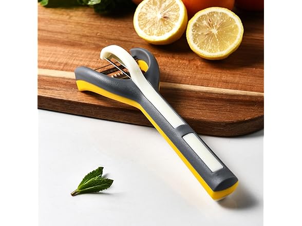 Our kitchen peeler has ultra sharp twin blades that follow the curves of produce and never gets stuck!