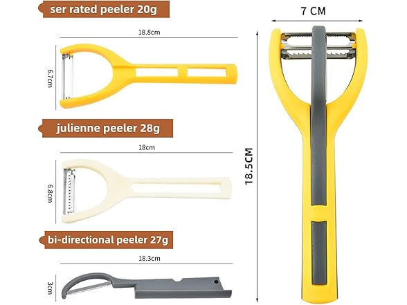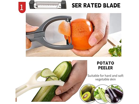 - 【3 in 1 Vegetable Peelers】Standard Bladessuitable for peeling hard peel. Serrated Blade: is more suitable for peeling soft fruit peel or smooth hard peel. As tomato, apple peeler. Julienne Peeler: Julienne carrot for make veggie sald or zucchini noodles have never been so simple.