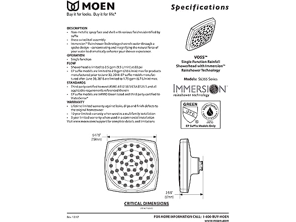 Moen Voss Brushed Nickel 6 Inch Single-Function Rainshower Showerhead with Immersion Technology, S6365BN