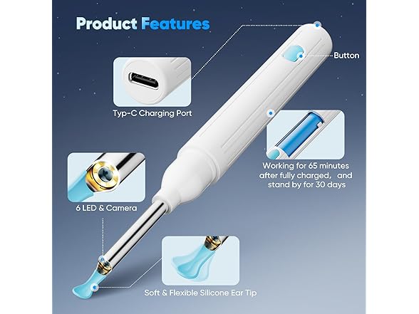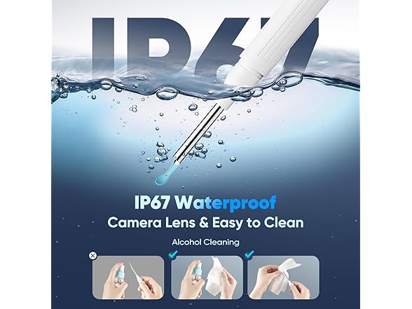 - Easy to Use: Connect easily via WiFi and Bluetooth to the earwax camera. The ear cleaner is equipped with a 130mAh battery, it can be used for 65 minutes when fully charged, and can be on standby for 30 days. IP67 waterproof otoscope, it can be washed with water or wiped with alcohol cotton after us, please do not immerse the entire otoscope in water